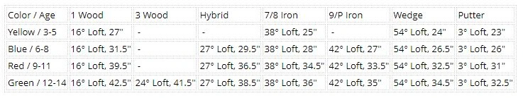 | Blue / 6-8 | 16° Loft, 31.5″ | – | 27° Loft, 29.5″ | 38° Loft, 28″ | 42° Loft, 27″ | 54° Loft, 26.5″ | 3° Loft, 26″ |